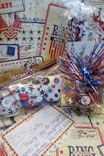 They also sent me the best patriotic decorative piece! So festive and fun, with the tinsel like fireworks going off. I love the vintage photo and there are so many added details - a Bingo card base, buttons, flags, a sparkly spangley ornament and shooting stars.